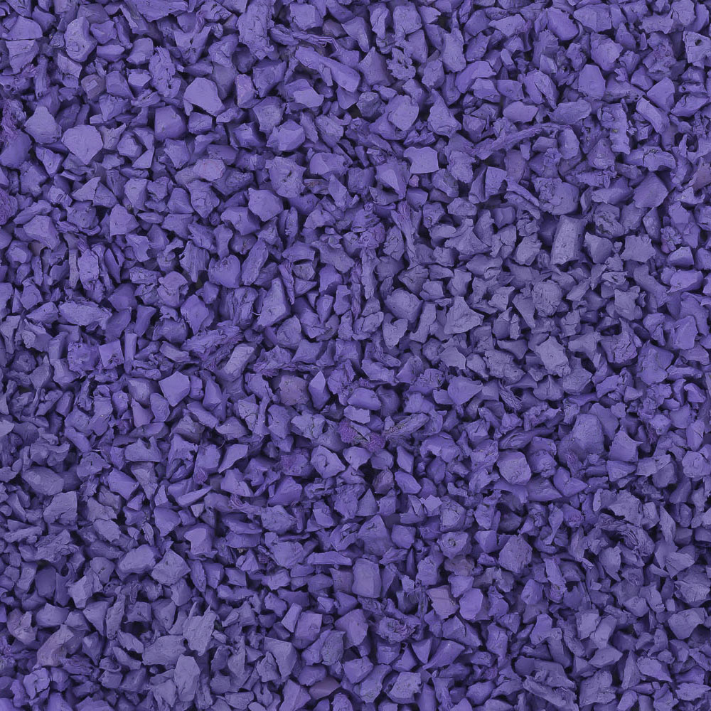 Фиолетовая крашеная крошка — это гранулят из переработанных шин, покрытый стойким пигментом. Из такого материала можно выложить рисунки или сделать однотонное покрытие на детской площадке. Оно не потускнеет со временем и переживёт любые механические нагрузки.