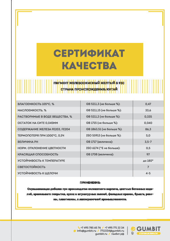 Жёлтый краситель для резиновой крошки — это порошкообразный железоокисный пигмент. Его смешивают с другими компонентами спортивных покрытий. Резиновая крошка, окрашенная жёлтым пигментом, станет отличным материалом для обустройства детской площадки.