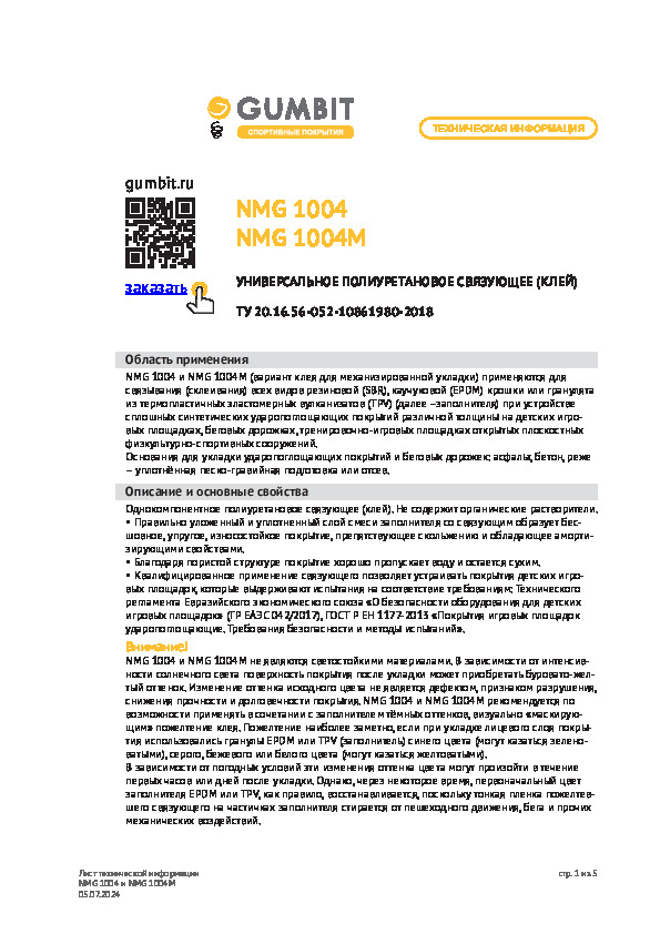 Клей NMG 1004 – это безопасный желтый клей, используемый при устройстве сплошных и ударопрочных беговых дорожек, а также тренировочных, детских и спортивных площадок. Смешивается с разными видами наполнителей – TPV гранулят, EPDM крошка (каучуковая), SBR крошка (резиновая). В образовавшейся полиуретановой массе отсутствуют органические растворители. После ее нанесения формируется упругая и бесшовная площадка, препятствующая скольжению.